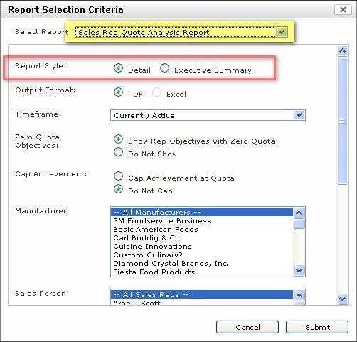 A summary version of the new Rep Quota Analysis report is now available. Choosing this option suppresses the objective level details and displays the totals for each rep only. Grouping and sub totals still occur for the various quota types.